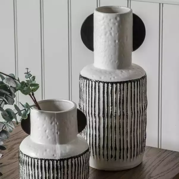 Featuring a monochrome colourway, the Throwley Vase will make a striking decorative piece for any room in your home. Beautifully made from stoneware, this unique shape vase features a ribbed design with a dark glaze finish. Pair this with the smaller version to create an eye-catching display in your home.