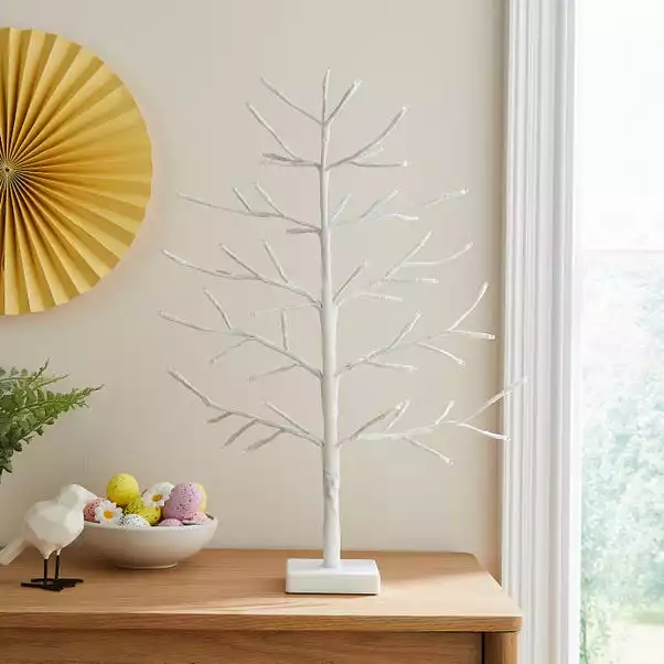 Dress up your tables this Easter with this serene white 2ft twig tree with 51 warm white LEDs. Branches are wrapped and are wipe clean. Just purchase 3 x AA batteries (NOT included) alongside the tree and light up your rooms!