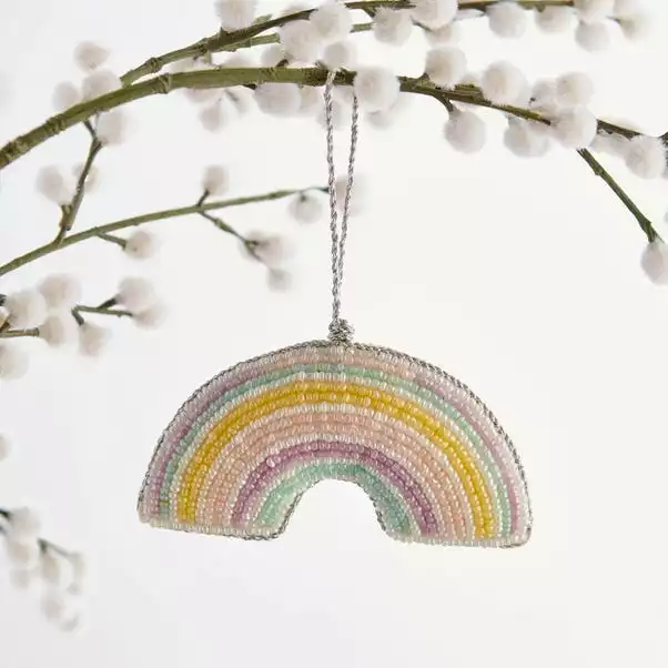 Crafted into a stunning rainbow arch shape and design, the pastel Beaded Rainbow Hanging Decoration has been hand embroidered and hand crafted. This rainbow is perfect for hanging around your home this Easter.