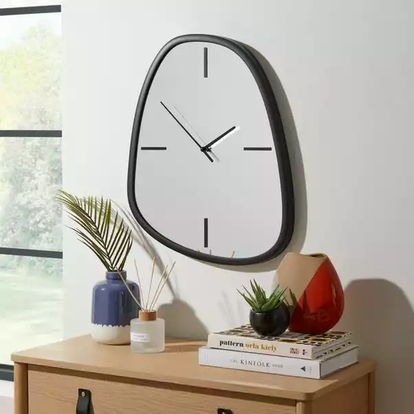 Add a luxurious finishing touch to your wall with this black framed Pebble wall clock. Designed on a silver mirror, this pebble clock features simple styled hands with a numeral bar in a contrasting black colourway. This stylish pebble clock will look beautiful with a range of home decors.