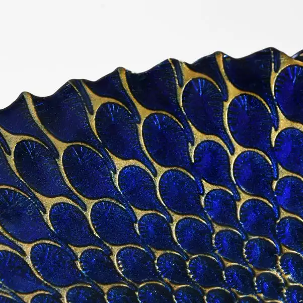 Crafted with a striking peacock feather design, this platter is fashioned with glass and decorated in teal blue.