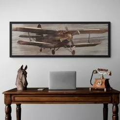 Add a classic and traditional feel to your space with this artwork by Edward Selkirk. Displayed in a wide landscape format, this piece is perfect to place in a living room, hallway or other open space to showcase the fine details of this old-fashioned plane while the muted tones and black frame offer an understated touch.