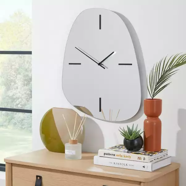 Add a stylish finishing touch to your wall with this Pebble frameless wall clock. Designed on a silver mirror, this pebble clock features simple styled hands with a numeral bar in a contrasting black colourway. This stylish pebble clock will fit in perfectly with a range of home decors.