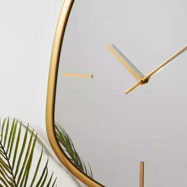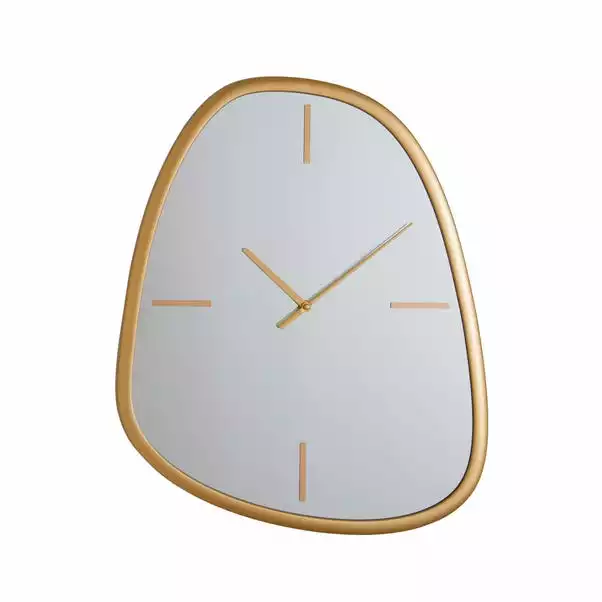 Add a luxurious finishing touch to your wall with this gold framed Pebble wall clock. Designed on a silver mirror, this pebble clock features simple styled hands with a numeral bar in a contrasting gold colourway. This stylish pebble clock will look beautiful with a range of home decors.