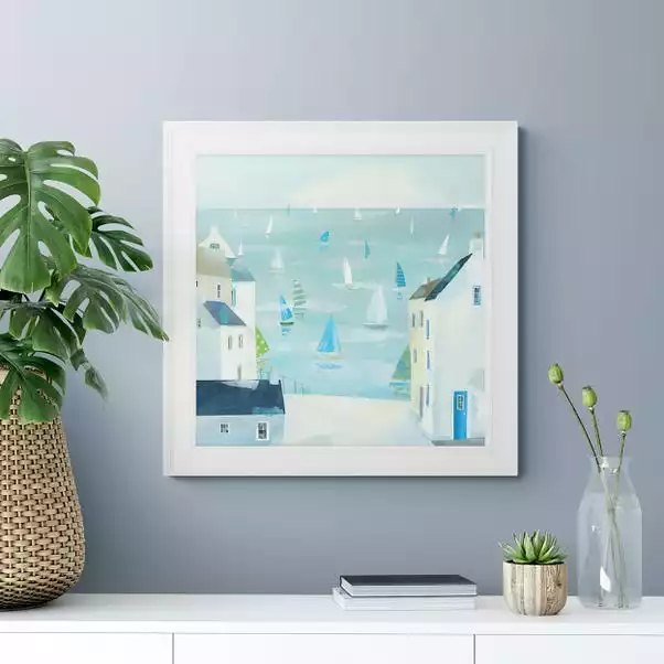 Light and bright, this print by Claire Henely shows a scenic illustration of a coastline full of fresh blue and green tones and a white border to emphasise the clean and clear look. Presented in a square format, this compact piece would look great in a small bathroom, bedroom or hallway.