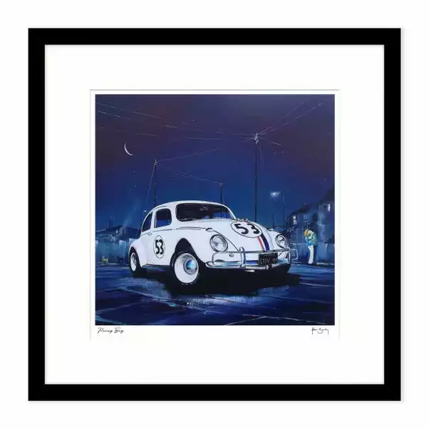 Add a nostalgic feel to your space with this artwork by Adam Barsby. Displayed in a compact square format, this piece is perfect for a car fanatic or just to add a little reminder of a classic Beetle car. To showcase the beauty of this car, the artwork is mostly set in a midnight scene with the gleaming white car at the forefront for an eye-catching look.