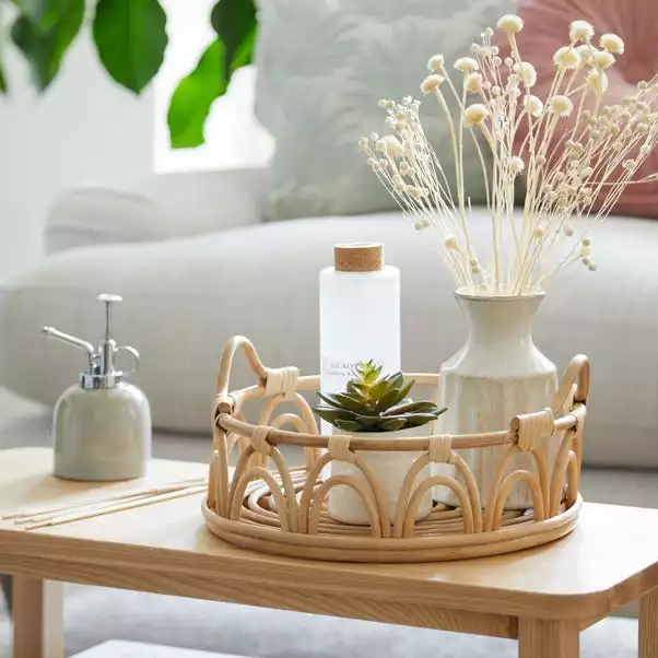 Featuring the 30cm Scalloped Bent Cane Tray, suitable for indoor use. This handmade decorative tray will add a touch of style to any room of the house. Made from 100% natural rattan materials and is easy to clean, this tray is perfect for placing ornaments and candles as well as books and small plant pots.
