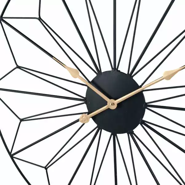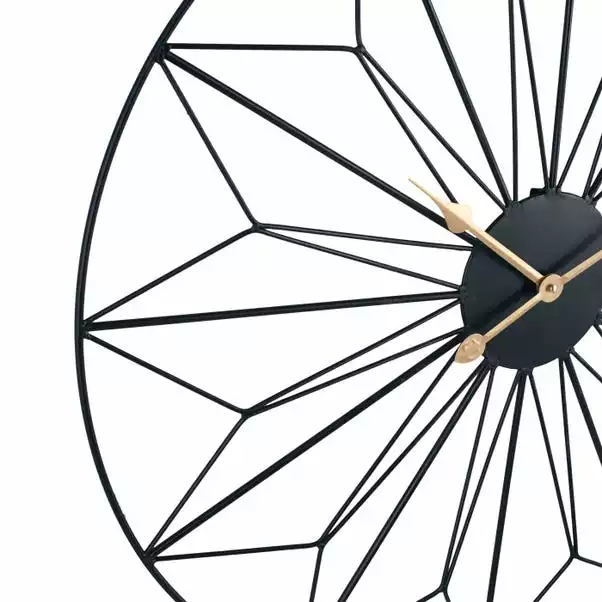 Combining decorative geometric design and practical clockwork together, the Black and Gold Geo Design Wall Clock showcases the elegant beauty of linework within this black metal frame. Featuring contrasting gold arrow styled hands and points to indicate the time instead of numeral figures, this wall clock demonstrates distinctive style and uniqueness to add a touch of contemporary style luxury to your home.